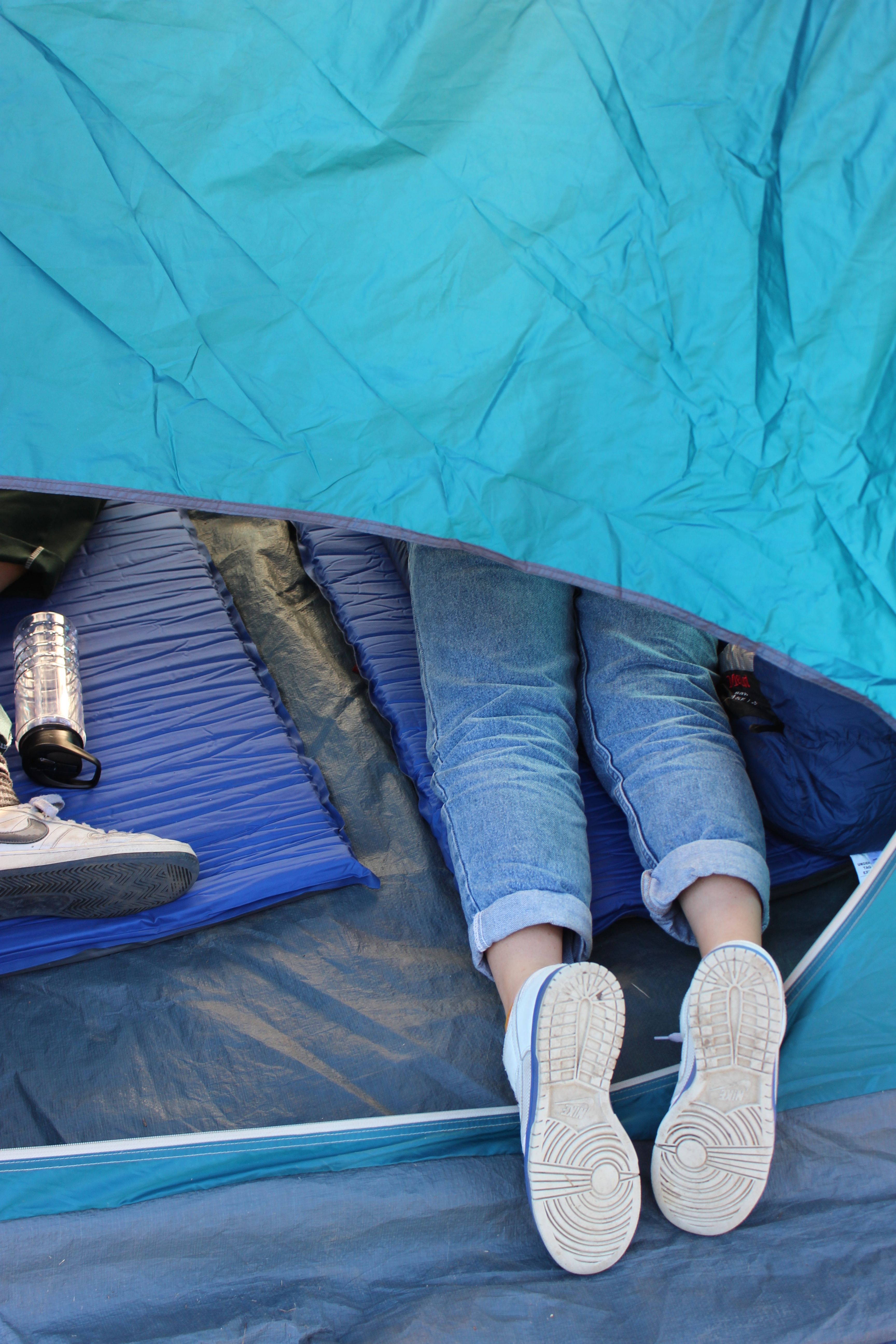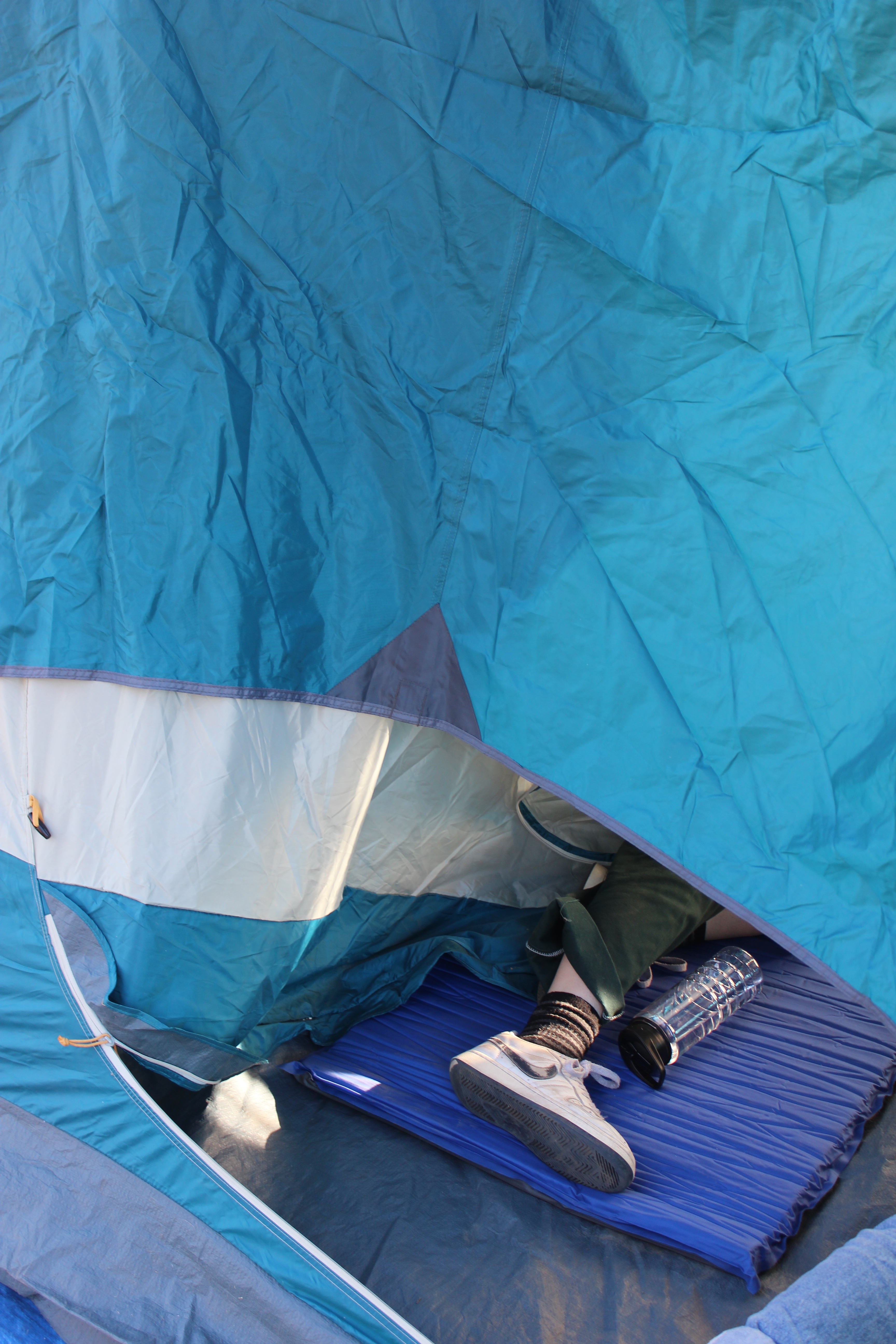 In junior year of high school, I was part of the Outdoors Club. I joined it mainly because a lot of my friends were in it. I hadn't had any outdoor experience since the science magnet trips (Catalina Island, Yosemite, Astro Camp) in middle school. Plus, I'd never gone camping before. My first camping experience was with this club. We headed up to a campsite in Malibu on a Saturday morning. Setting up a tent for the first time was quite an experience, and after I had successfully gotten my tent up, I walked around the campsite with my camera. That's when I came across Em and Anya's blue tent, blue shoes, and blue sleeping pads; their camping blues. I positioned my camera, and the sound of the shutter was drowned by the giggles from inside the tent.
