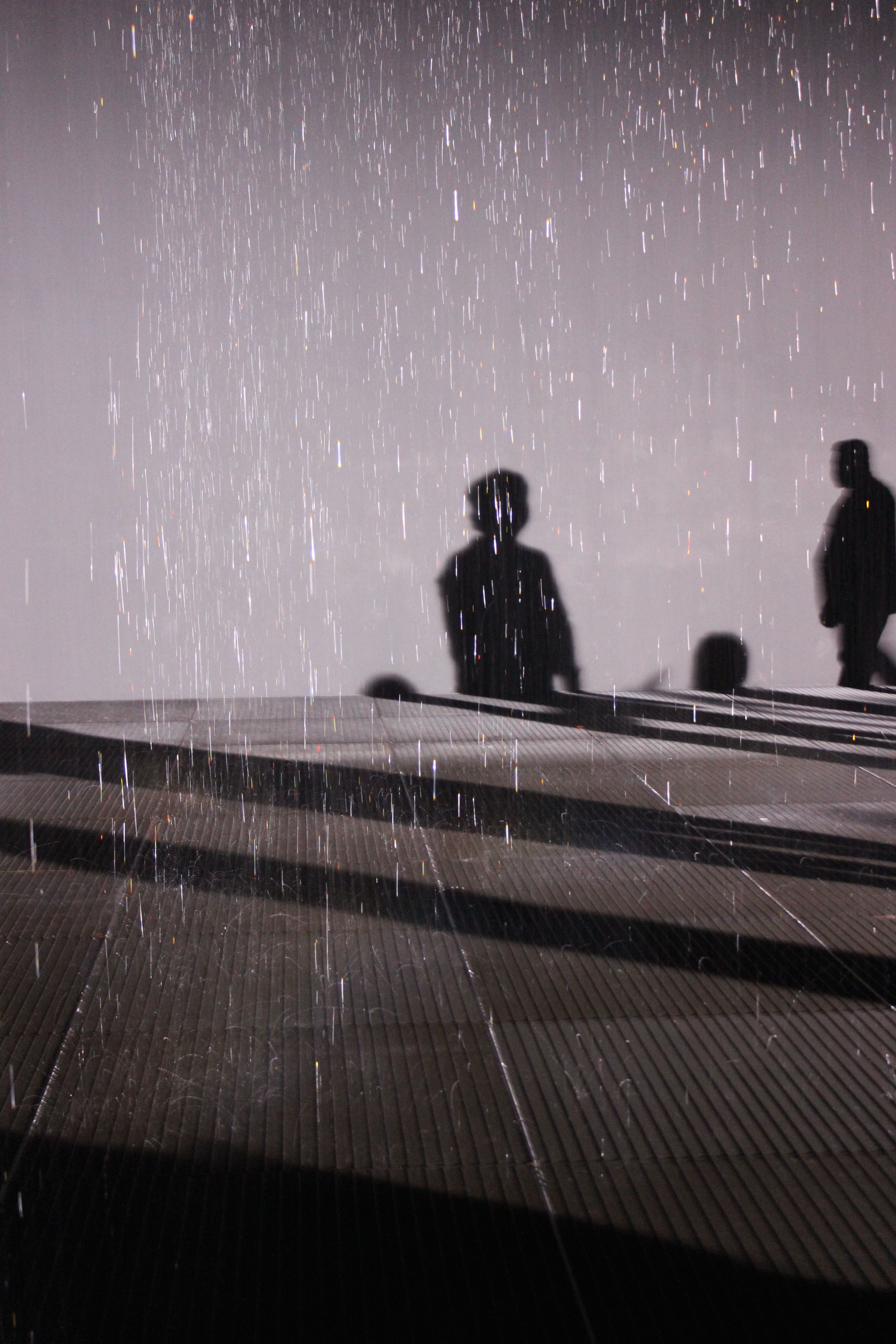 My sister and I always try to check out exciting and unique art exhibits that come to visit Los Angeles. This time the Rain Room by Hannes Koch and Florian Ortkrass was visiting the Los Angeles County Museum of Art. It had become very popular, and tickets were limited -- we were lucky to be able to go see it. The rain room is a simulation in a room that mimics rain fall, but as you walk through the installation, it detects your presence, and the rain does not fall on you, allowing you to walk through rain without getting wet. This gave people to safely take photos in the rain, without worrying about ruining their devices. There was a single bright light at the corner of the room that shone over the whole exhibit, angled so that long shadows were cast on the opposite wall. With lots of people spread throughout the exhibit, it was hard (but not impossible) to be able to get a good picture of yourself in the rain room. Though I was fascinated with the concept of the rain room, I was disappointed with the photos I was taking, until I turned around, away from where everyone else was, and saw the long shadows dance across the dry walls that met the wet floor.