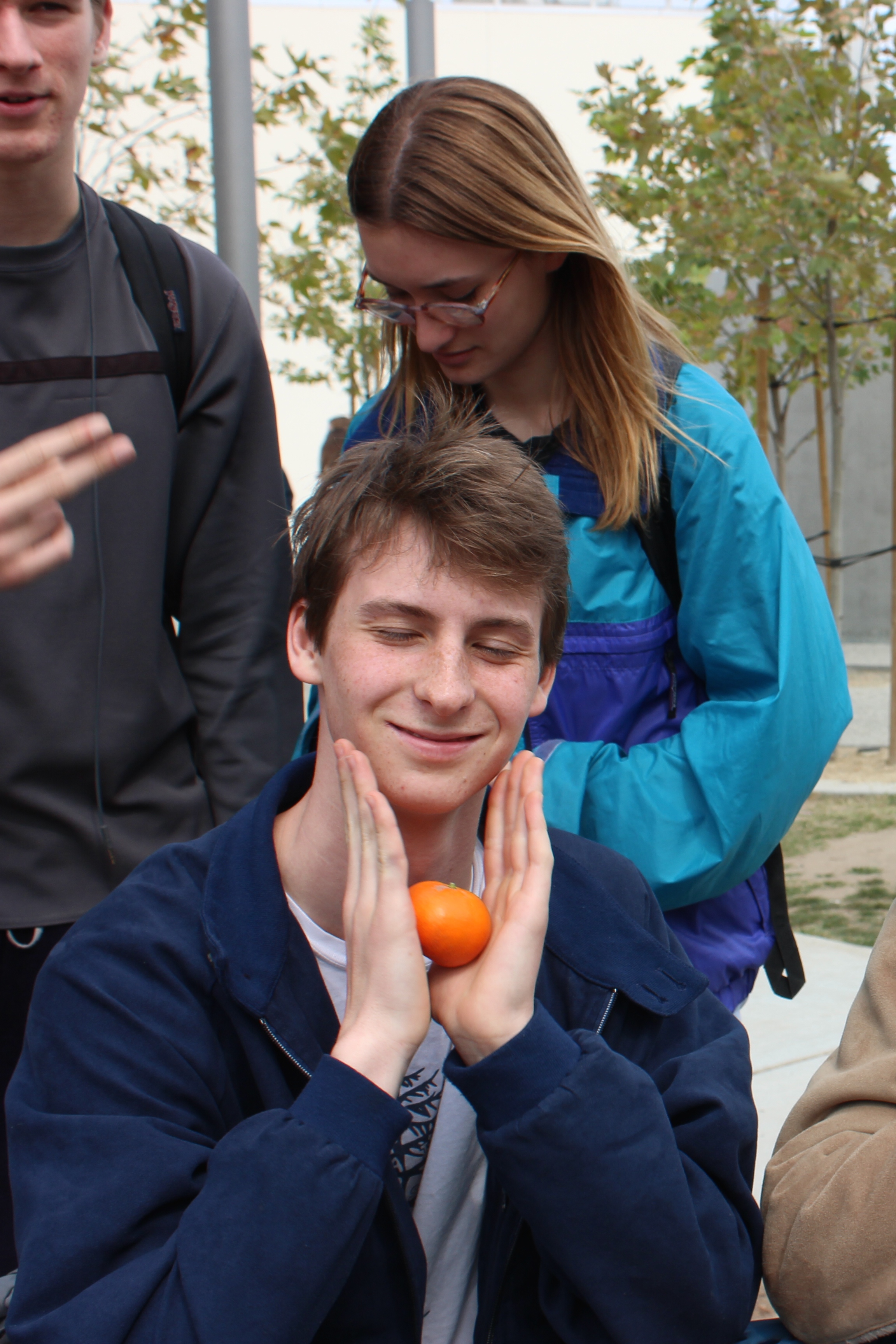 We were always an animated group at lunch time. A whole group of us would sit at a blue round table that was too small to fit all of us, so oftentimes there were at least a few people standing or sitting on the ground or the grass. That day I was one of those standing, and Emmett was one of those who was sitting. Emmett has one of the kindest and warmest hearts, and I was lucky enough to capture his joyous spirit in a silly yet simple photo of him with an orange.